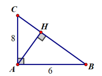 VD: Cho tam giác `ABC` vuông tại `A` có `AB = 6` cm, `AC = 8` cm. Hãy tính độ dài cạnh `BC`, đường cao `AH` và các đoạn thẳng `BH, CH`.