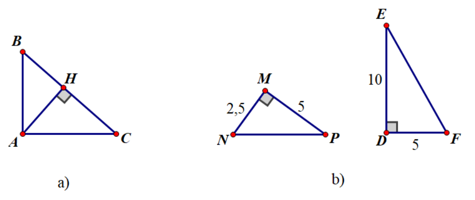 b) Tam giác vuông `MNP` và tam giác vuông `DEF` có các kích thước như hình `b` có đồng dạng với nhau không?