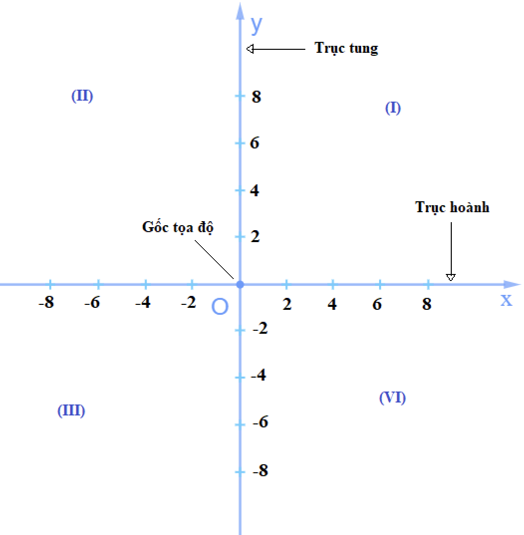 `-` Trục `Ox, Oy` gọi là các trục toạ độ. `Ox` gọi là trục hoành, `Oy` gọi là trục tung. `O` gọi là gốc toạ độ.