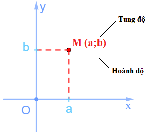 `+` Cặp số `(a;b)` gọi là toạ độ của điểm `M`, `a` là hoành độ và `b` là tung độ của điểm `M`.