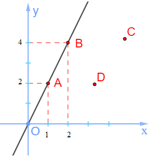`+` Quan sát đồ thị trên ta thấy: Điểm `A` và `B` là hai điểm thuộc đồ thị hàm số `y=2x`; hai điểm `C` và `D` không thuộc đồ thị hàm số `y=2x`.