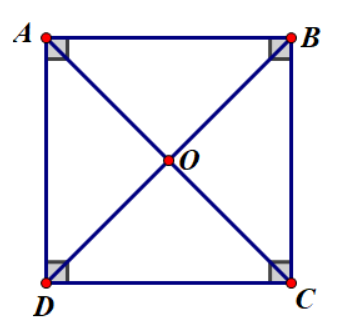 VD: Cho hình vuông `ABCD` có hai đường chéo `AC` và `BD` cắt nhau tại `O`. Chứng minh các tam giác `OAB`, `OBC`, `OCD`, `ODA` là những tam giác vuông cân.