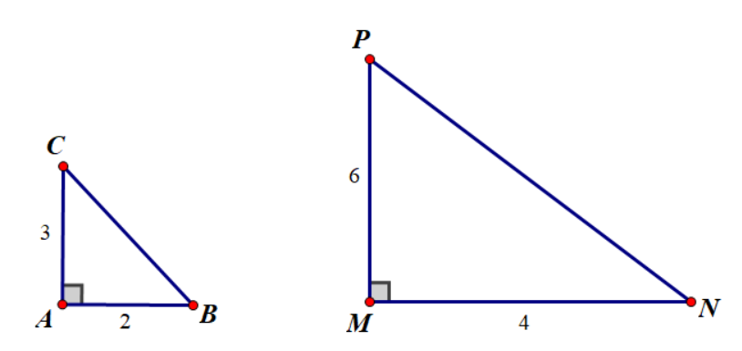 `hatA = hatM=90^o` và `(AB)/(MN)=(AC)/(MP)` ( vì `2/4=3/6=1/2`)