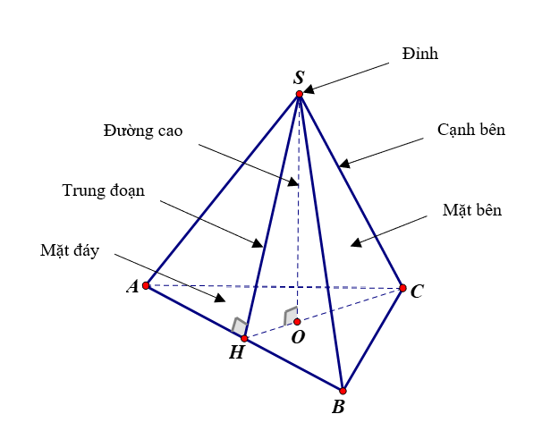 `-` Đường cao vẽ từ đỉnh của mỗi mặt bên gọi là trung đoạn của hình chóp tam giác đều.
