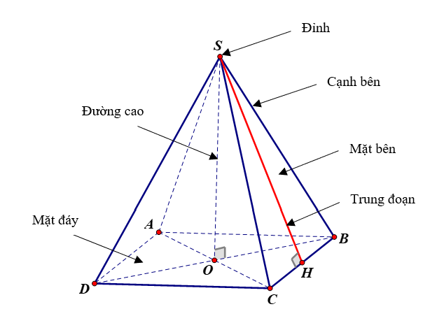 `-` Chân đường cao kẻ từ đỉnh tới mặt đáy là điểm cách đều các đỉnh của mặt đáy (giao điểm hai đường chéo).