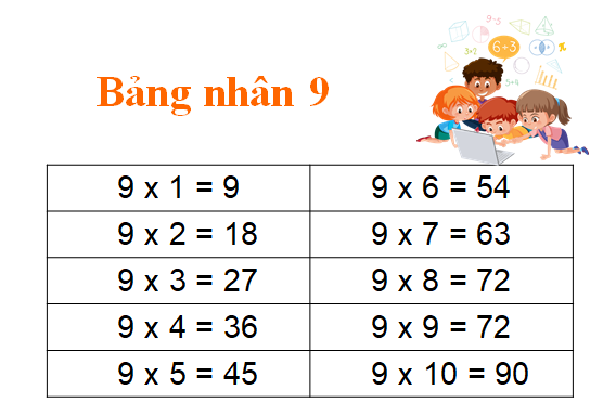 Mỗi tấm thẻ có `9` chấm tròn. Lần lượt lấy ra `1,2,3` tấm thẻ rồi nêu các phép nhân tương ứng: