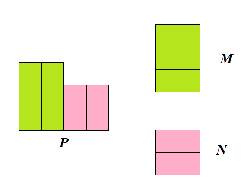 Ví dụ: Hình `P` gồm `10` ô vuông như nhau được tách thành hình `M` gồm `6` ô vuông và hình `N` gồm `4` ô vuông.