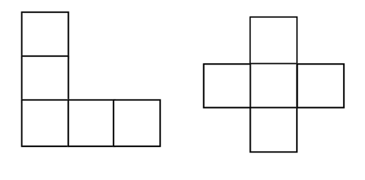 Ví dụ: Hình thứ nhất và hình thứ hai đều có `5` ô vuông như nhau nên ta nói diện tích của hình thứ nhất bằng diện tích của hình thứ hai.