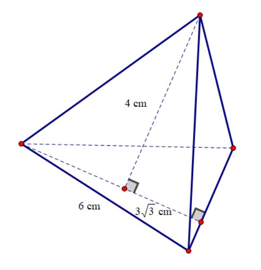 VD`1`: Tính thể tích của hình chóp tam giác đều (hình vẽ), biết chiều cao hình chóp là `4` cm, tam giác đáy có cạnh `6` cm và chiều cao `3sqrt 3` cm.
