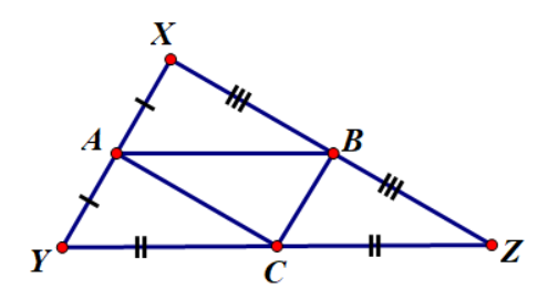 Vì `A,B` lần lượt là trung điểm của `XY` và `XZ` nên `AB` là đường trung bình của tam giác `XYZ`. Tương tự ta cũng có `BC` và `CA` là các đường trung bình của tam giác `XYZ`.