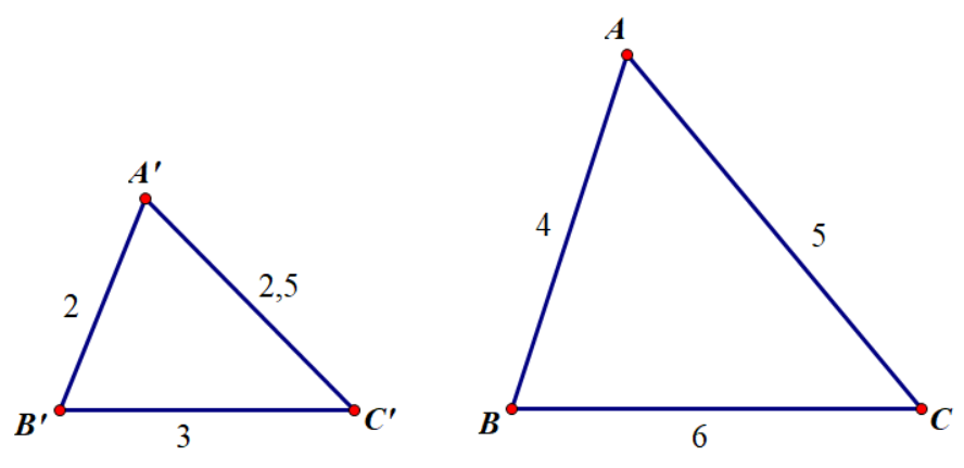 Nhận xét: Xét `DeltaABC,DeltaA'B'C'` có `(A'B')/(AB)=(A'C')/(AC)=(B'C')/(BC)=1/2`