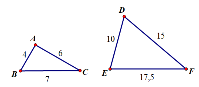 VD: Cho tam giác `ABC` và tam giác `DEF` có kích thước các cạnh như hình vẽ.