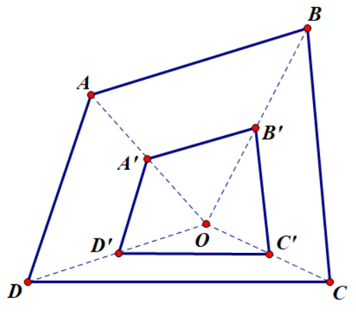 - Các đoạn thẳng `A'B',B'C',C'D',D'A'` lần lượt là hình đồng dạng phối cảnh của các đoạn thẳng `AB,BC,CD,DA` theo tỉ số `1/2`.
