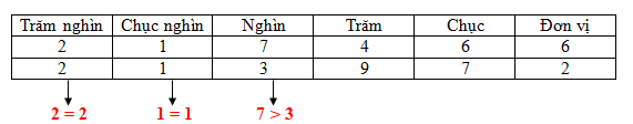 Nếu hai số có cùng số chữ số, ta lần lượt so sánh từng cặp chữ số trên cùng một hàng (kể từ trái sang phải), cho đến khi xuất hiện cặp chữ số đầu tiên khác nhau. Ở cặp chữ số khác nhau đó, chữ số nào lớn hơn thì số đó lớn hơn.
