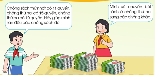+) Lấy tổng số sách chia cho `3` được số sách san đều vào mỗi chồng