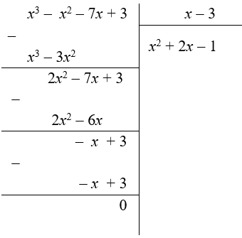Vậy `(x^3 - x^2 - 7x + 3) : (x - 3) = x^2 + 2x - 1`. Đây là một phép chia hết.
