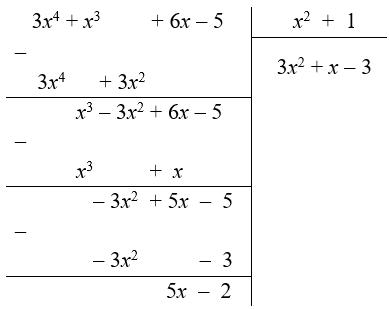 Vậy `(3x^4 + x^3 + 6x - 5) : (x^2 + 1)` bằng `3x^2 + x - 3` và dư `5x – 2`.