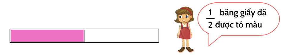 * Ánh chia băng giấy thành `2` phần bằng nhau, tô màu vào một phần