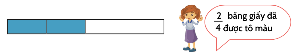 * Ngân chia băng giấy thành `4` phần bằng nhau, tô màu vào `2` phần