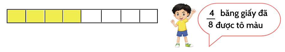 * Minh chia băng giấy thành `8` phần bằng nhau, tô màu vào `4` phần