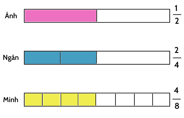 Ta nói các phân số `1/2, 2/4, 4/8` là các phân số bằng nhau.