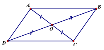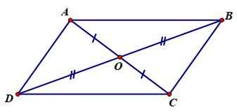 Tứ giác `ABCD` là hình bình hành nên: `{(AB////CD;AD////BC,,,,),(AB=CD;AD=BC,,,,),(hat A =hat C;hat B=hat D,,,,),(OA=OC;OB=OD,,,,):}`