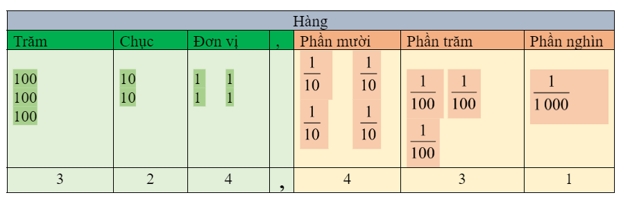 Số gồm `3` trăm, `2` chục, `4` đơn vị, `4` phần mười, `3` phần trăm, `1` phần nghìn.