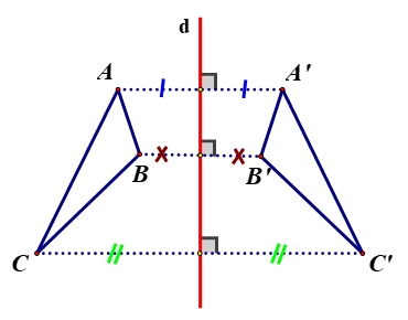 Hai tam giác `ABC` và `A’B’C’` đối xứng với nhau qua trục `d`