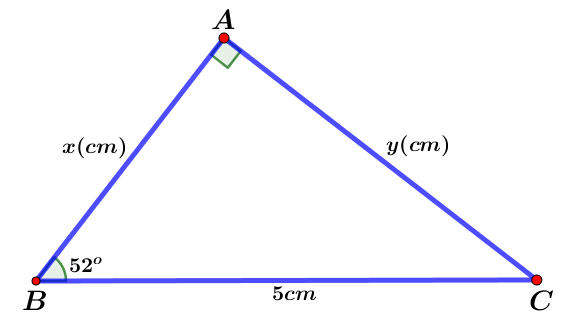`AC = BC . sin B`, suy ra `y = 5. sin 52^@ ~~ 3,94 (cm)`.