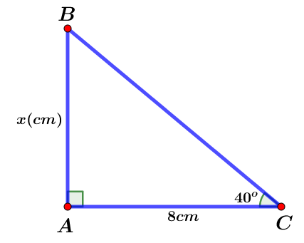 `AB = AC . tan C`, suy ra `x= 8. tan 40^@ ~~ 6,71 (cm)`.