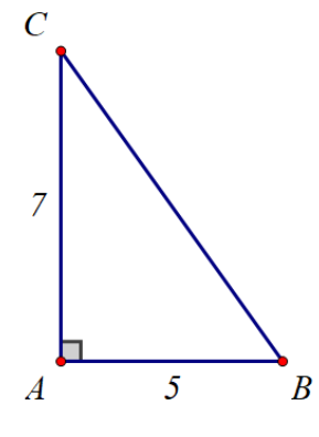 `BC^2 = AB^2 + AC^2` (theo định lí Pythagore), suy ra `BC^2 = 5^2 + 7^2 =74` hay `BC = sqrt 74 ~~ 8,6 (cm)`;