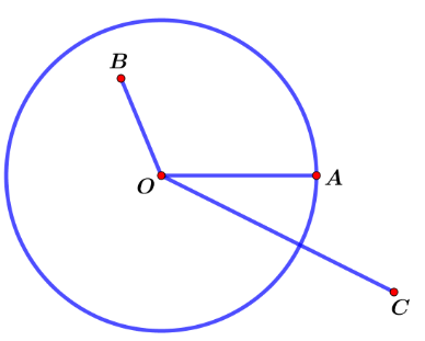- Ví dụ: Cho đường tròn `(O; R)` và `3` điểm `A, B, C` (hình vẽ). So sánh độ dài các đoạn thẳng `OA, OB, OC` với `R`.