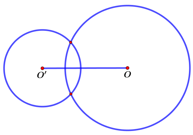 - Nhận xét: Cho hai đường tròn `(O; R)` và `(O'; r)` với . Người ta chứng minh được khẳng định sau: Nếu hai đường tròn đó cắt nhau thì `R - r < OO' < R + r`. Điều ngược lại cũng đúng.