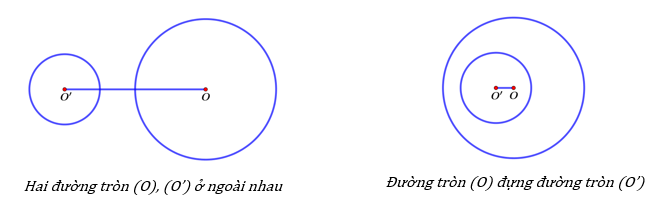 - Nhận xét: Cho hai đường tròn `(O; R)` và `(O'; r)`. Người ta chứng minh được các khẳng định sau: