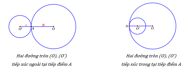 - Nếu hai đường tròn đó tiếp xúc ngoài thì tiếp điểm nằm giữa `O, O'` và `OO' = R + r`. Điều ngược lại cũng đúng.