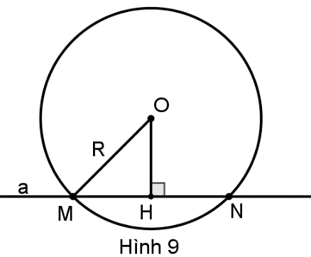 - Đường thẳng `a` cắt đường tròn `(O; R)` khi khoảng cách từ tâm `O` đến đường thẳng `a` nhỏ hơn `R` và ngược lại (Hình `9`).