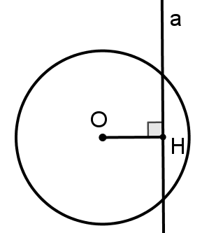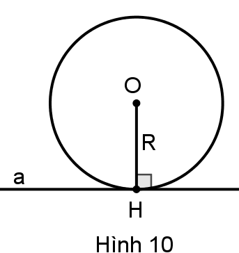 - Đường thẳng `a` tiếp xúc với đường tròn `(O; R)` khi khoảng cách từ tâm `O` đến đường thẳng `a` bằng `R` và ngược lại (Hình `10`).