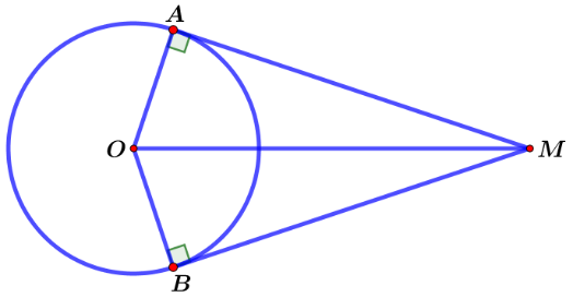 Ví dụ: Cho đường tròn `(O; R)` có `MA, MB` là `2` tiếp tuyến cắt nhau. Như vậy, theo tính chất `2` tiếp tuyến cắt nhau ta có: