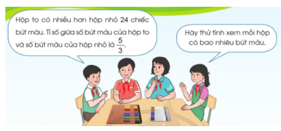 Bài toán: Hiệu của hai số là `24`, tỉ số của hai số đó là `5/3`. Tìm hai số đó.