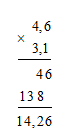 - Hai thừa số `4,6` và `3,1` có tất cả `2` chữ số ở phần thập phân nên ta viết dấu phẩy sao cho ở tích cũng có `2` chữ số ở phần thập phân.