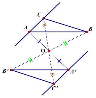 Hai tam giác `ABC` và `A’B’C’` đối xứng với nhau qua tâm `O`