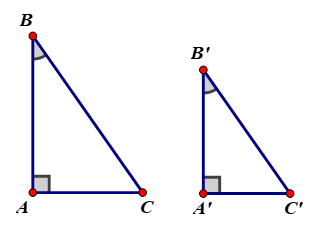 Giả thiết: `△ABC;△A'B'C';hatA=hat(A')=90^o;hatB=hat(B')`