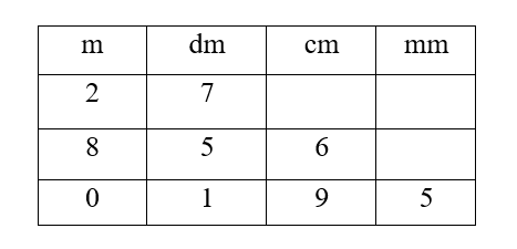 + `2m 7dm` hay `2 7/10 m` được viết thành `2`,`7m`