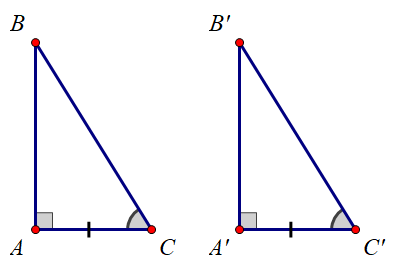 + Nếu một cạnh góc vuông và một góc nhọn kề cạnh ấy của tam giác vuông này bằng một cạnh góc vuông và một góc nhọn kề cạnh ấy của tam giác vuông kia thì hai tam giác vuông đó bằng nhau