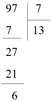 Vậy `97 : 7 = 13` (dư `6`)
