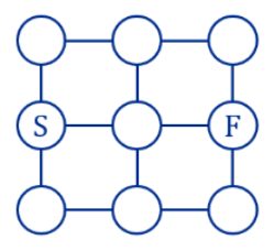 Hồng Xiêm chỉ có thể bước từ hình tròn nọ tới hình tròn kế tiếp nếu giữa chúng có đúng 1 đường nối. Hồng Xiêm bắt đầu bước từ vị trí S và mất chính xác 4 bước để tới vị trí F. Hỏi có bao nhiêu cách để Hồng Xiêm từ vị trí S đến vị trí F? Biết với mỗi cách, bạn ấy không thể bước tới mỗi hình tròn nhiều hơn 1 lần.