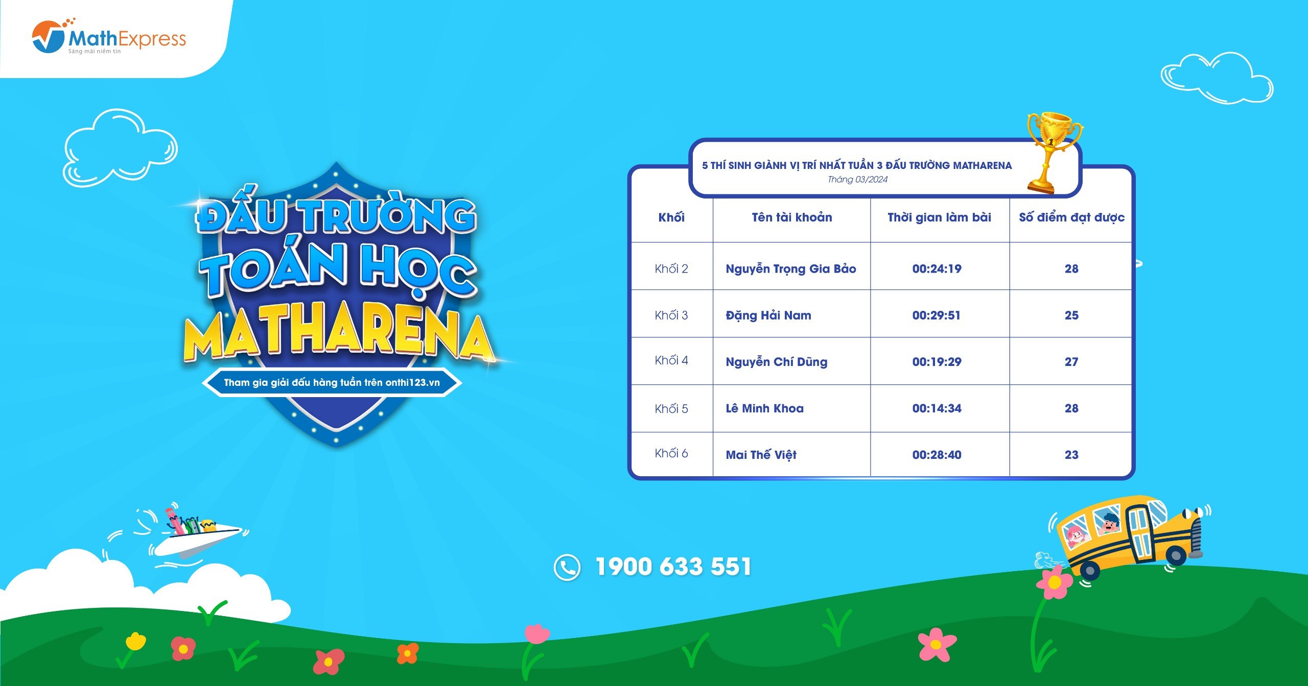 “Đường đua” MathArena tháng 03/2024 chỉ còn 2 “chặng” nữa sẽ chính thức kết thúc. Trận đấu thứ 3 tối ngày 16/03 vừa qua đã chứng kiến một màn “đấu trí” thú vị của hơn 100 em học sinh đến từ khối 2 – 6. Để biết 5 thí sinh đã về đích đầu tiên là ai, MathExpress mời các bậc phụ huynh và các em học sinh tham khảo bài viết sau đây.